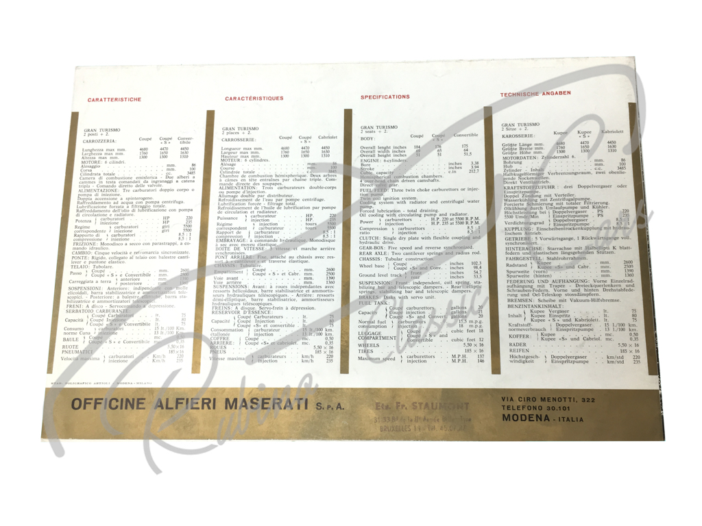 Advertising brochure / pamphlet for various MASERATI 3500 GT – VIGNALE – SEBRING models – ORIGINAL